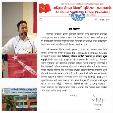 सामान्य चिकित्सा,नर्सिङ र फार्मेसीमा २५ प्रतिशत शुल्क वृद्धि गर्ने निर्णय खारेज गर्न अखिल (समाजवादी) को....